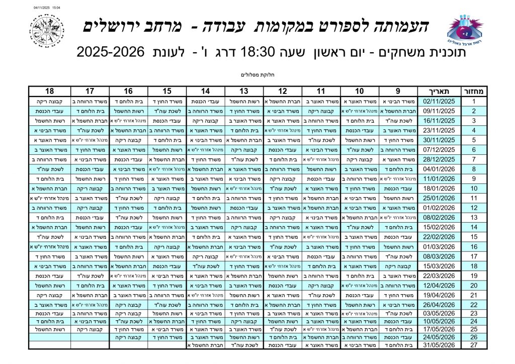 | 6 | 1 | 02/11/2025 | א | 19:30 | 118 | משרד החוץ ד | 36 | בית הלוחם ד | 2 | 0 | 974 | 729 |