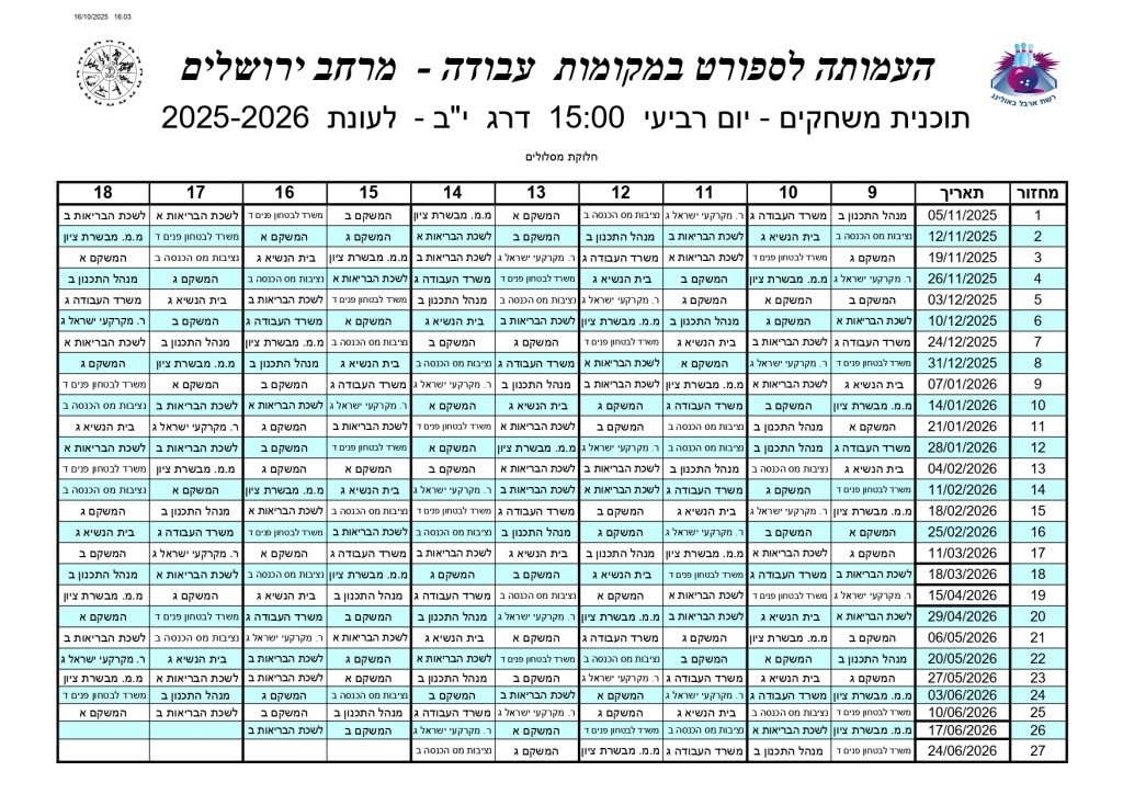 | 12 | 1 | 05/11/2025 | ד | 15:00 | 176 | משקם ב | 17 | מ. מ. מבשרת ציון א | 2 | 0 | 921 | 737 |