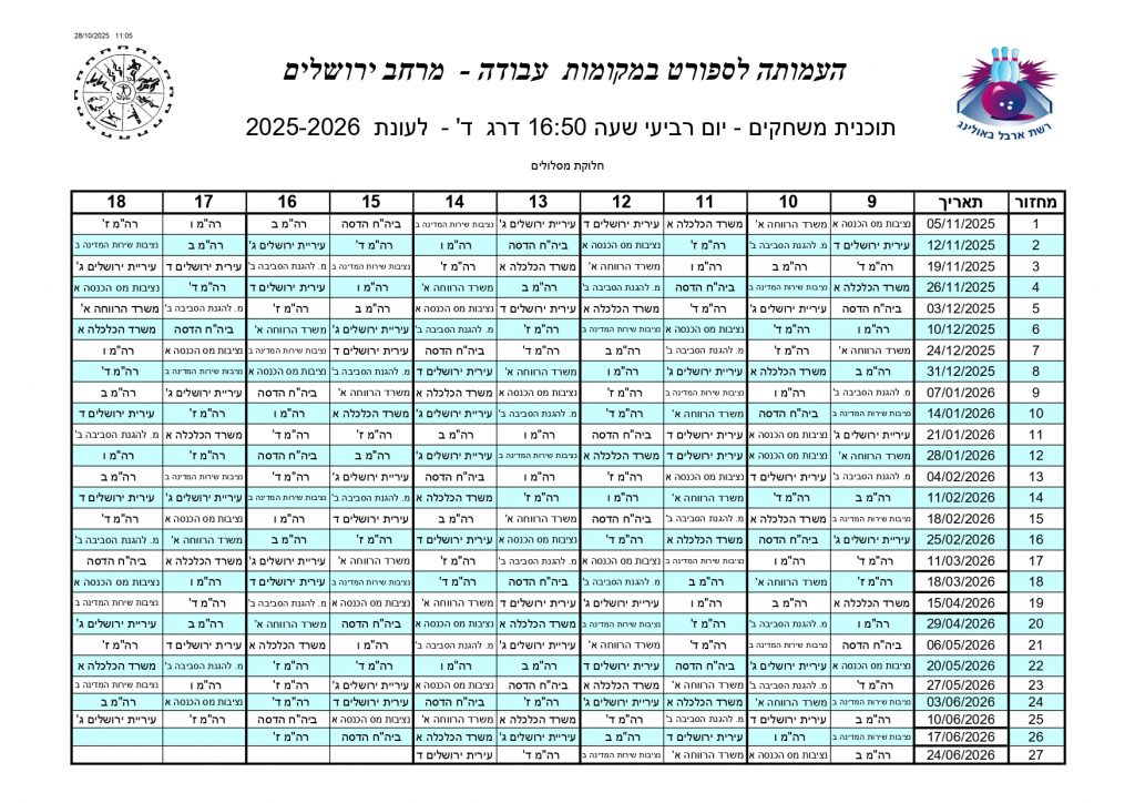 | 4 | 1 | 05/11/2025 | ד | 16:50 | 73 | עיריית ירושלים ג | 114 | נציבות שרות המדינה ב | 4 | 0 | 976 | 818 |