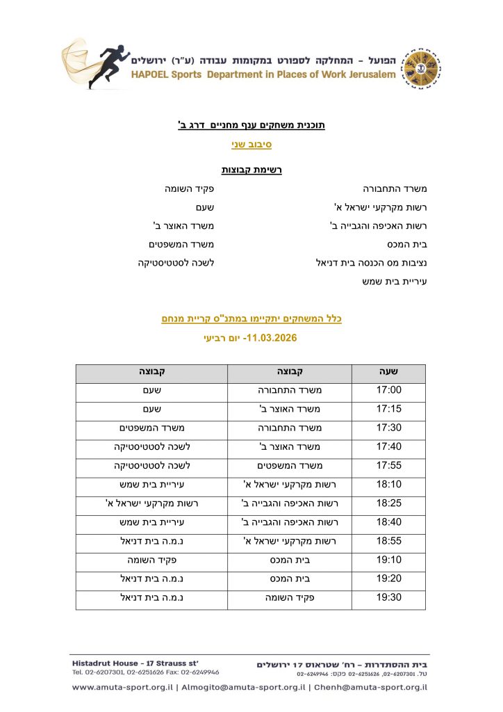 | 9 | משרד האוצר ב | 7 | 4 | 3 | 0 | 8 | 6 | 11 |