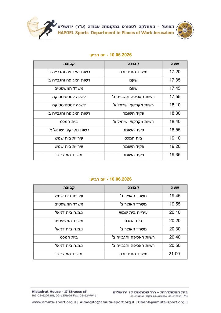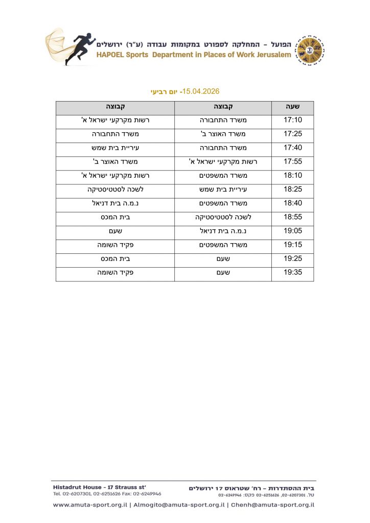 | 5 | ר.א והגבייה ב | 10 | 5 | 5 | 0 | 10 | 10 | 15 |